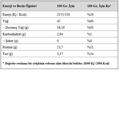Kuru madde ağırlıkça en az %45 süt yağı içerir. Yaklaşık 12 litre sütten 1 kg Tam Yağlı Antep Peyniri üretilmiştir. Çiftliğimizde kendi ürettiğimiz yem ile beslenen ineklerimizin